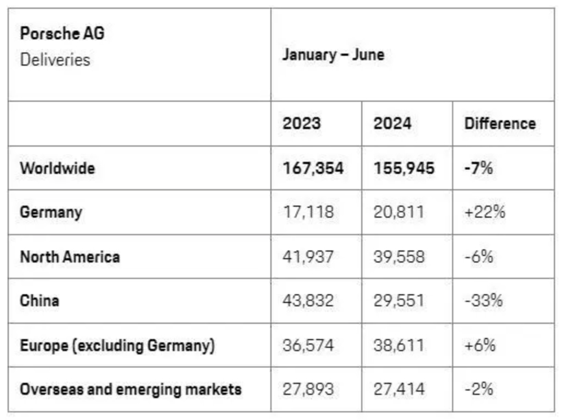 保时捷官方公布的数据显示,上半年,保时捷全球销量为15.59万辆,较去年同期的16.74万辆,同比减少7%。其中,在中国市场销量为29551辆,较去年同期的43832辆减少33%。