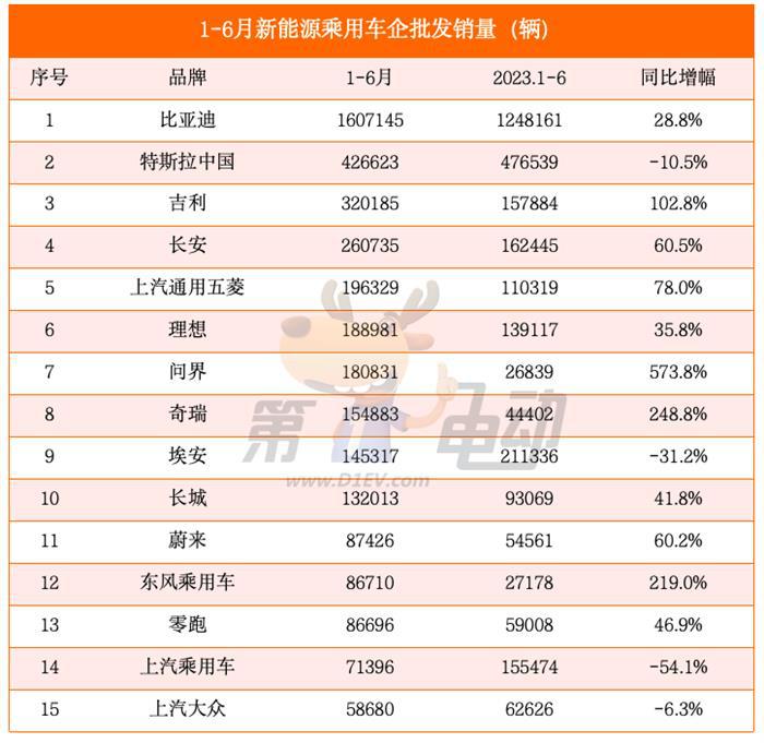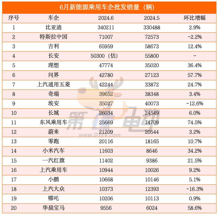 6月新能源车企批发销量榜中,继去年12月批发销量达340,178辆后,今年6月比亚迪批发销量再次突破34万辆,达到340,211辆,创历史新高,稳居中国汽车市场销量冠军。