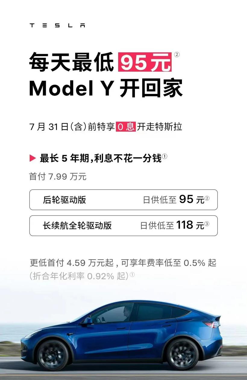 以Model 3与Model Y的长续航全轮驱动版(车价分别为27.19万元和29.09万元)为例,7月31日(含)之前下订:首付7.99万元,可选5年0息方案,Model 3日供低至107元,Model Y日供低至118元。