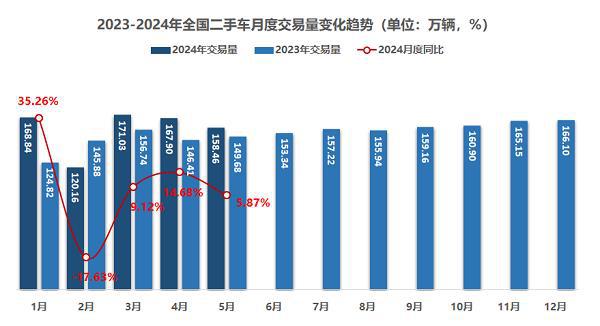 销量方面,流通协会公布了今年前五个月二手车市场的详细数据。2024年5月,全国二手车市场交易量158.46万辆,环比下降5.62%,同比增长5.87%;交易金额为1023.31亿元。其中,新能源二手车共交易8.57万辆,环比下降3.8%,同比增长51.7%。