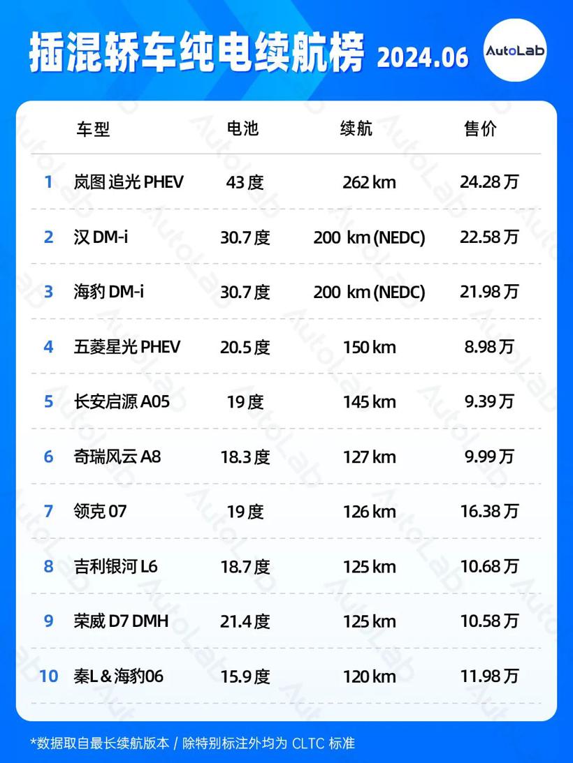 6月份的续航榜如期而至,为了让榜单更具参考性,我们把纯电续航榜分成了轿车、SUV、MPV三大类,另外还新增了增程SUV、插混SUV、插混轿车的细分榜单,供大家参考。