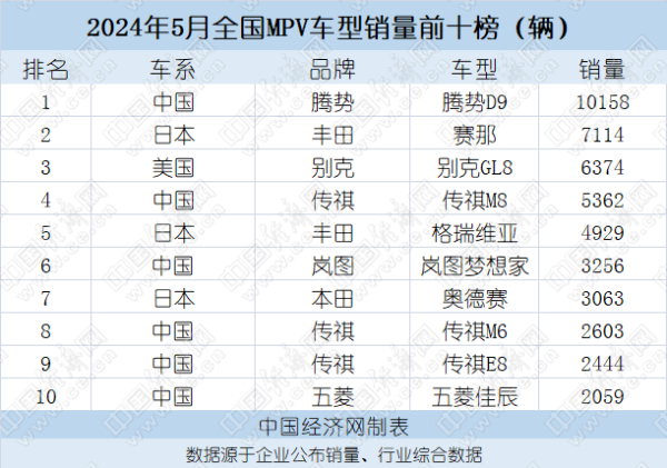 根据中国汽车流通协会乘用车市场信息联席分会发布的数据,5月全国MPV车型零售7.8万辆,同比下滑18.3%;1-5月累计零售39.6万辆,同比下滑8.8%。在销量前十榜单中,中国品牌占比过半,达到六款,日系与美系分别有三款和一款车型入榜。