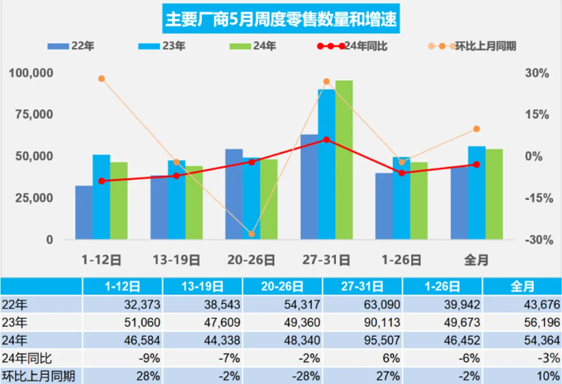 因此,我们可以看到在连续数月增幅维持在10%左右后,5月纯电零售销量同比突然扩大至27.4%,销量达到49.5万辆,环比4月增加近9万辆,这应该也是5月新能源能大幅增长38.5%的重要原因之一。