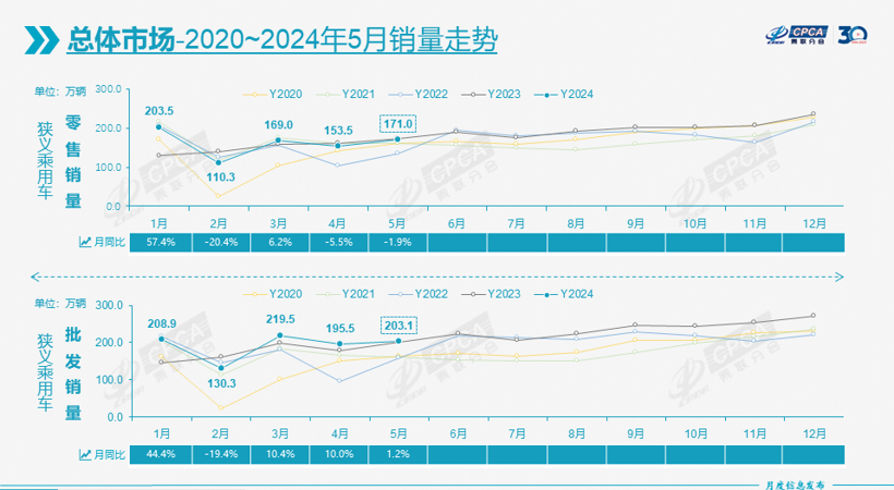 根据6月11日乘联会公布的数据,5月国内狭义乘用车零售销量为171.0万辆,这是今年内的次高表现,仅低于1月的203.5万辆。然而,由于去年同期的销量高达174.2万辆,5月零售市场同比再次走跌,跌幅为1.9%。
