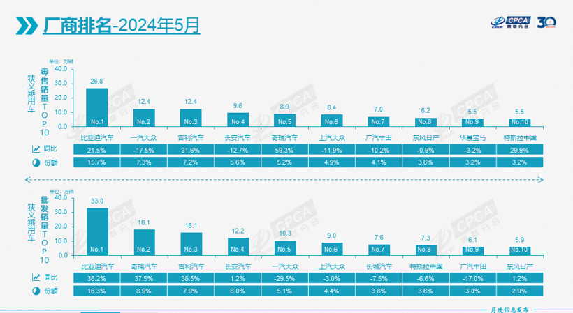 关于5月车企十强名单,还值得注意的是,5月两家日本车企——广汽丰田和东风日产同时出现在批发榜单中,前者是今年内第一次上榜,后者是继1月之后再次回归。这也是两者今年内首次同时在零售和批发榜单中占有一席之地。
