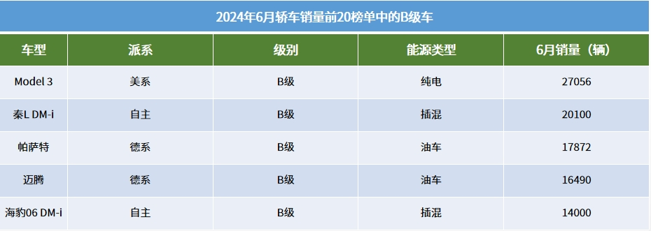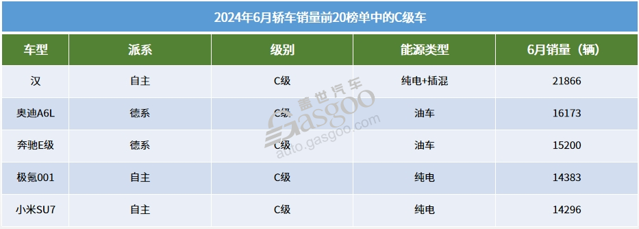 6月份的国内C级轿车市场上,已经呈现出自主新能源产品,力压传统豪车的大格局,比亚迪汉、极氪001以及备受关注的小米SU7,都进入到了月度轿车畅销榜,反观传统豪车品牌,只有两款车型入榜。