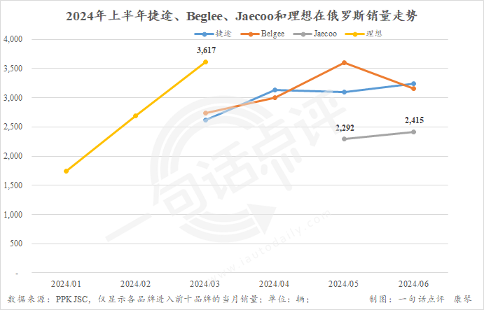 此外,欧萌达、捷途和Jaecoo的表现也非常亮眼。比如,欧萌达C5售出近2万辆,由于去年7月捷途才正式进入俄罗斯市场,上半年主要是早期铺货成交量非常少,因此6月和上半年销量都同比增幅都是成千上万倍。