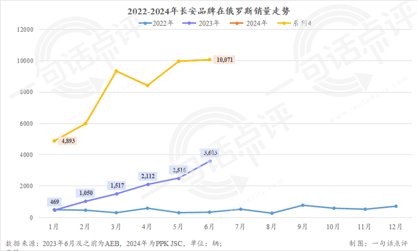 长安之所以会有如此大幅的增幅,是因为尽管长安已进入俄罗斯多年,但体量一直较小,2022年及之前月销基本只有三位数,直到2023年才开始爆发式增长,年销量首度破万,并创下4.8万辆的历史新高。