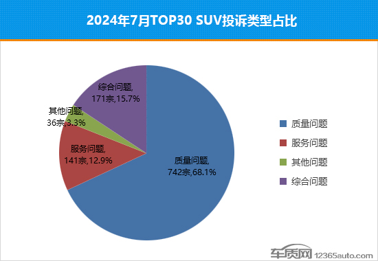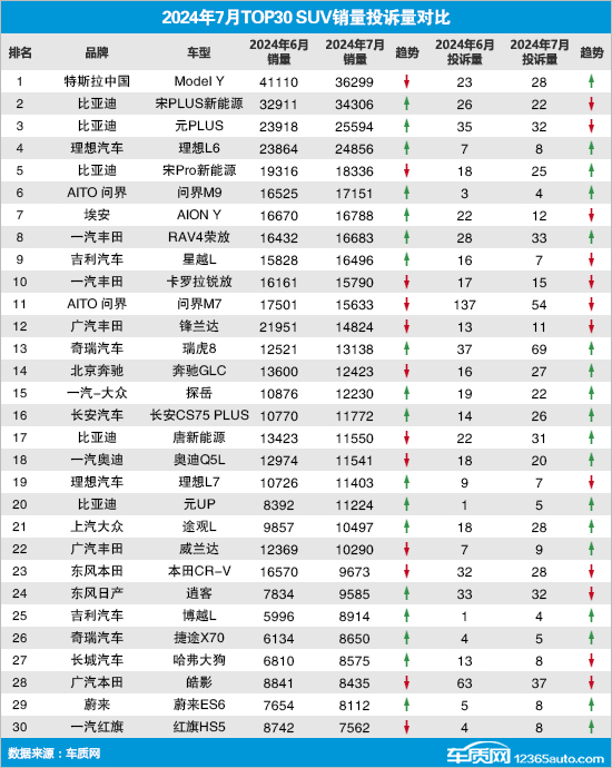 据乘联会提供的全国汽车产销数据显示,2024年7月份国内SUV市场累计零售销量84.8万辆,环比下降5.1%,同比微增0.6%。同期,车质网受理车主针对SUV的有效投诉4,819宗,环比上涨19.9%,同比下降47.3%。去除投诉人自愿申请撤诉的信息后,2024年7月TOP30 SUV销量投诉量排名如下: