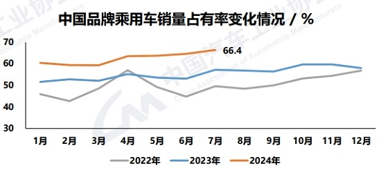 在乘用车市场中,中国品牌市占率进一步提升。7月,中国品牌乘用车销量为132.3万辆,同比增长10.1%,占乘用车销售总量的66.4%,比上年同期提升9.2个百分点;1-7月共销售874.2万辆,同比增长21.6%,市场份额为62.6%。