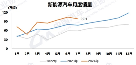 相比车市整体,新能源汽车是为数不多的亮点。7月,新能源汽车产销分别完成98.4万辆 和99.1万辆,同比分别增长22.3%和27%,市场占有率达到43.8%;1-7月分别完成591.4万辆和593.4万辆,同比分别增长28.8%和31.1%,市场占有率达到36.4%。