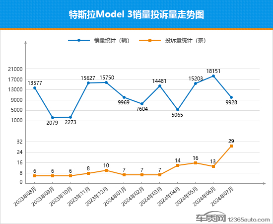 进入2024年,特斯拉Model 3的市场表现充满起伏,月销量也是忽高忽低,与特斯拉Model Y的稳如老狗形成鲜明对比。4月,特斯拉Model 3的销量降至年内的最低点,随后迎来了连续两个月的环比增长,6月的销量创造了近一年来的最高纪录。但随后7月份近乎断崖式的下跌,再次截断了特斯拉Model 3的上升之路。屋漏偏逢连夜雨,伴随着销量下滑,其投诉量环比出现翻倍增长,达到近一年来的最高点,短期口碑表现转差。据车质网数据显示,特斯拉Model 3的故障问题集中在“部件开裂”和“灯罩裂纹或变形”,部分车主反馈车辆的氛围灯存在开裂问题,但厂家对车主的诉求置之不理,迟迟不予解决,导致投诉持续高企。另外,从其7月份的投诉销量比数值来看,较6月份有明显提高,从个位数升至两位数,投诉销量比表现开始出现退步。就特斯拉Model 3目前的市场表现来看,销量走势或将难以在短期内企稳。