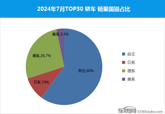 从榜单车型的国别占比情况来看,自主品牌占比进一步扩大,达到6成,较上个月提高了6.7个百分点。德系品牌依旧是占比第二大的国别品牌,但与6月份相比下降了3.3个百分点。
