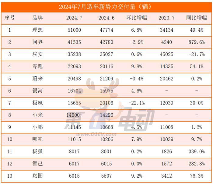 时隔7个月(去年12月交付50,353辆),理想销量再次突破5万辆达到51,000辆,创历史新高,连续两个月蝉联新势力榜冠军;继6月突破2万辆后,7月零跑销量再次突破2万辆达到22,093辆,再创历史新高,再次超越蔚来,跻身榜单第四。