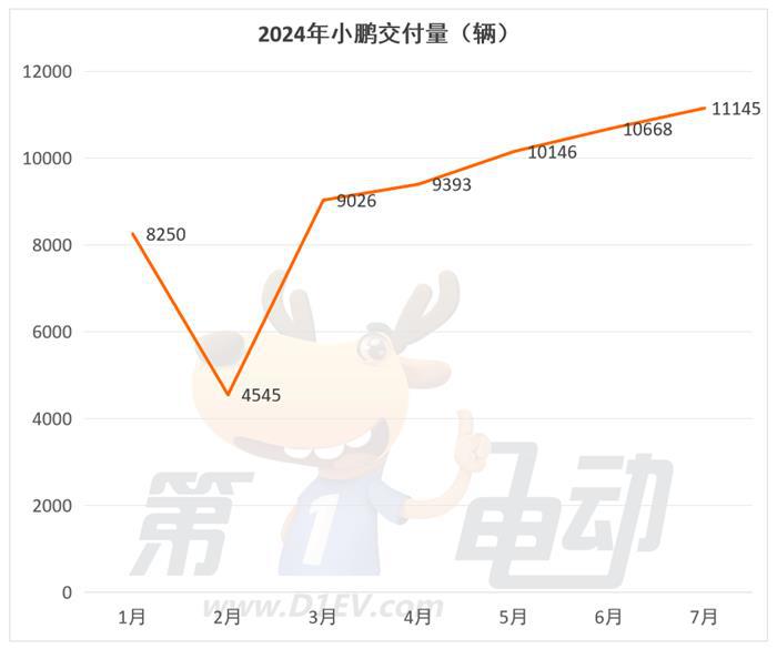 7月,小鹏汽车共交付新车11,145台,同比增长1%,环比增长4%。其中,小鹏X9交付1,459台,上市7个月累计交付14,602台。2024年1-7月,小鹏汽车累计交付新车共63,173台,同比增长20%。