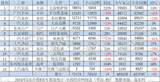 乘联会数据显示:5月国内B级轿车零售24万辆,较去年同期增长4%,环比增长10%;1-5月零售数量114.42万辆,累计增幅13%。相较于细分市场销量同比“双升”,合资B级轿车市场表现略显“疲软”,20款车型5月累计销量124690辆,同比上升2.12%;前五月累计销量627263辆,同比下滑近5%。