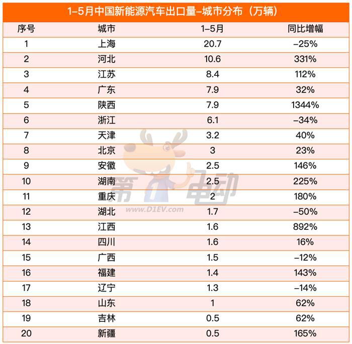 浙江、湖北、广西和辽宁四个省的出口量同比也出现下滑。而陕西、江西、河北、安徽、湖南、福建、新疆的出口量同比均实现翻倍暴涨,且陕西出口量同比暴涨超13倍,其出口量暴涨的原因预计是比亚迪出口量的大涨。1-5月比亚迪出口量为17.62万辆,同比增长1.6倍。