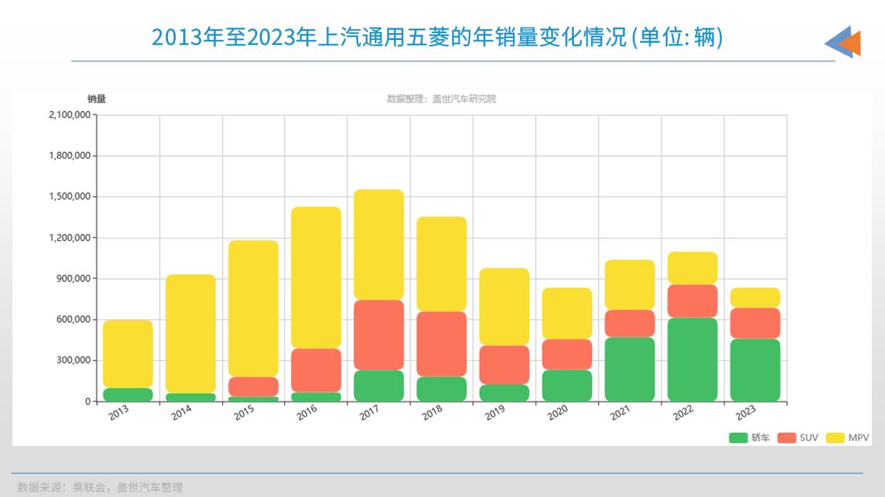 上汽通用五菱虽然是非典型的合资车企(和其他主流合资车企主售外方品牌车型不同,上汽通用五菱虽是中外合资企业,但主售的一直都是中方品牌产品),但最近几年的销量下滑势头同样很明显。峰值时期,上汽通用五菱也曾年销超150万辆乘用车,但去年上汽通用五菱的乘用车年销量已经降至80余万辆。
