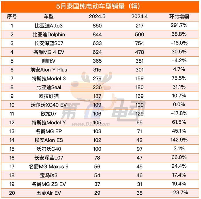 五菱在泰国市场仅有一款车Air EV在售,这款车5月环比下降24%;长安销量环比大降10%,主要是由于旗下深蓝S07销量环比大降16%所致。