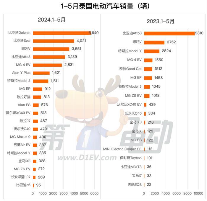比亚迪3款车进入前五,比亚迪海豚和海豹进入泰国市场后,销量迅速崛起,让比亚迪成为泰国市场销量王。