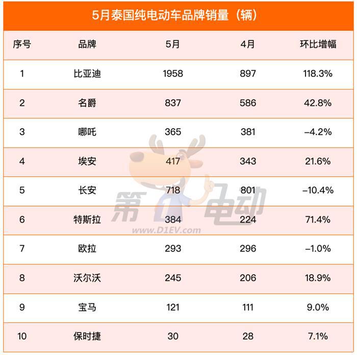5月TOP10泰国电动车品牌榜中,除了特斯拉、宝马和保时捷外,其余7个品牌均来自中国。TOP10纯电动车品牌的销量占比高达98%,且中国纯电动车品牌占据88.3%,5月比亚迪实现翻倍暴涨。