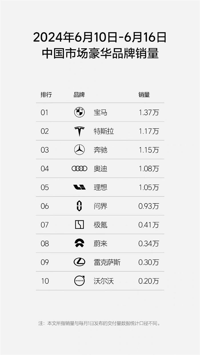 在 2024 年第 24 周(6 月 10 日至 6 月 16 日)豪华品牌周销量排名中,出现了颇为引人注目的变化。宝马展现出强劲的势头,在上周还以 1.05 万辆排名第四的情况下,本周实现了大幅增长,销量达到 1.37 万辆,成功超越奔驰、理想以及特斯拉,一举跃升为第一名,充分彰显了其品牌实力和市场竞争力。
