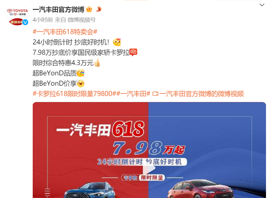 6月18日,一汽丰田官方微博发布消息,即日举行24小时限时特卖会。