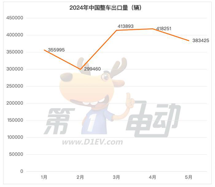 根据易车公布的各国海关汽车出口数据,5月中国汽车(包括商用车)出口销量383,425辆,环比下降8.3%,同比上涨23.8%。