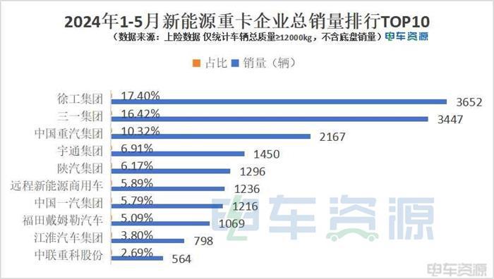 2024年5月,销量冠军企业是徐工集团,销售997辆,占比18.79%;销量亚军企业是三一集团,销售861辆,占比16.23%;销量季军企业是中国一汽集团,销售412辆,占比7.77%。