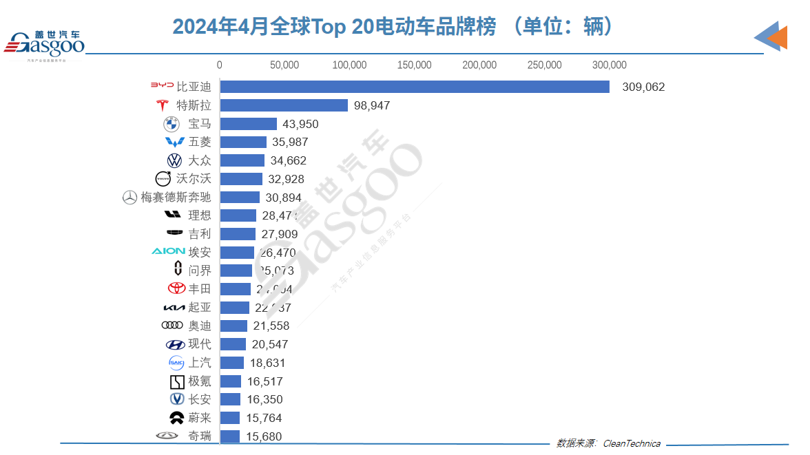 4月全球Top 20电动车品牌榜:福特标致等出局,蔚来和极氪上榜