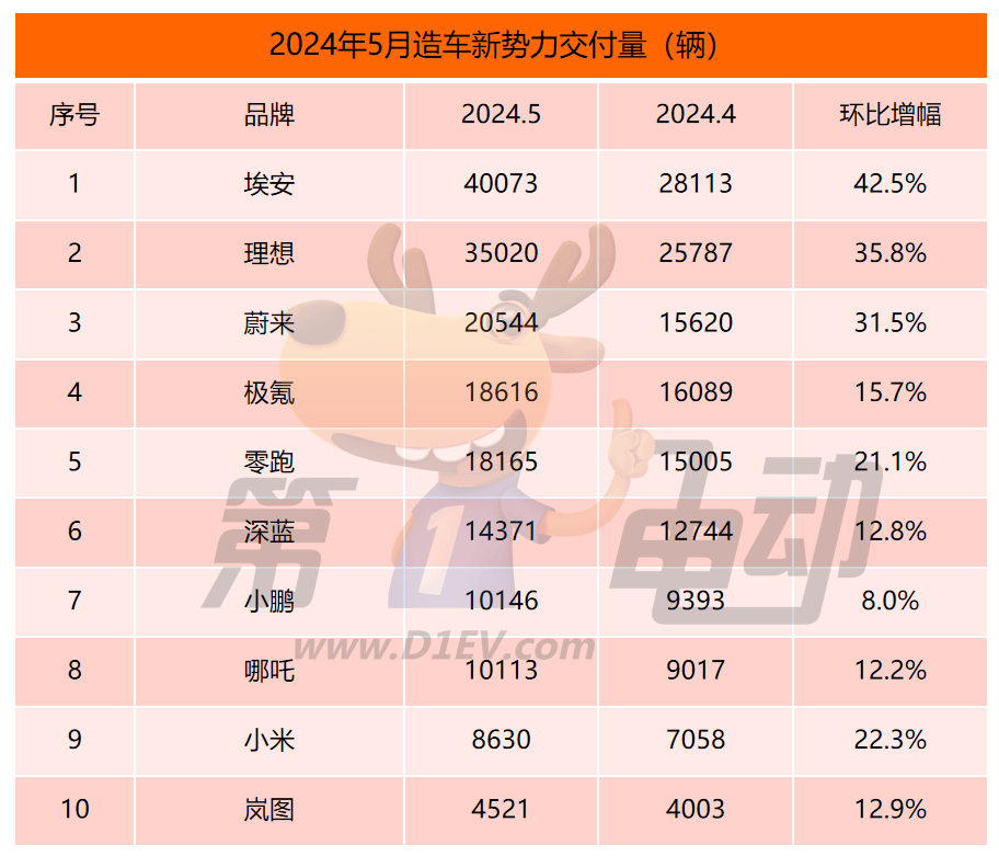 5月,TOP10新势力销量环比均实现增长。其中,蔚来和极氪销量再创历史新高,前者销量时隔11个月,再次突破2万台,达到20,544台,重回前三;后者销量突破1.8万台,跻身榜单第四。