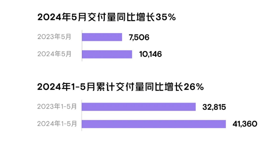 至此今年1-5月,小鹏汽车累计交付新车41,360辆,相较于去年同期的32,815辆,增长26%。