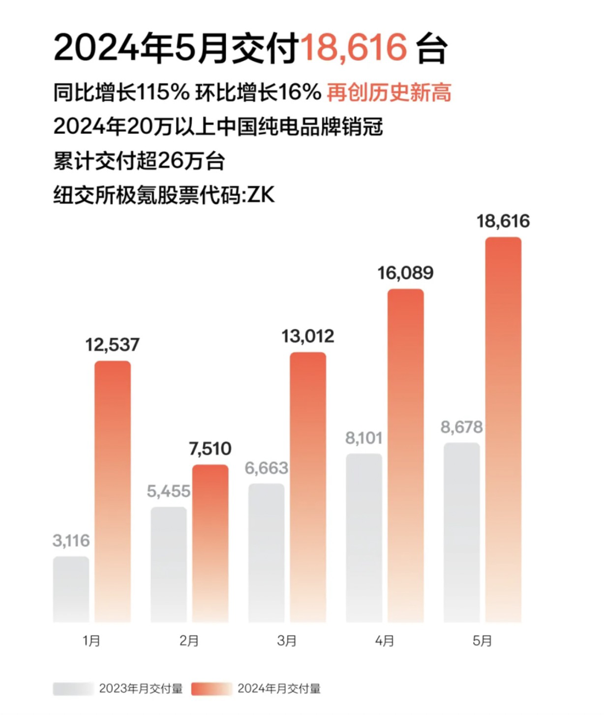 数据显示,极氪汽车5月交付新车18,616台,同比增长115%,环比增长16%,再创历史新高。截止目前已累计交付超26万台。