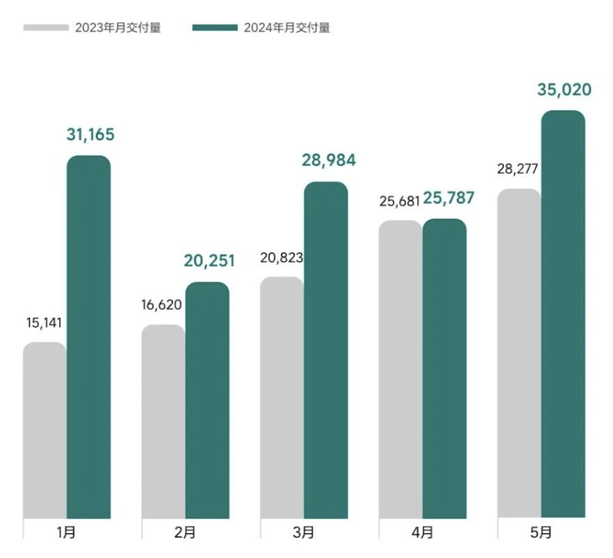 6月1日上午,理想发布5月交付数据。数据显示,5月理想汽车交付新车35,020辆,同比增长23.8%,较上个月增长35.8%。截至2024年5月31日,理想汽车累计交付774,571辆。