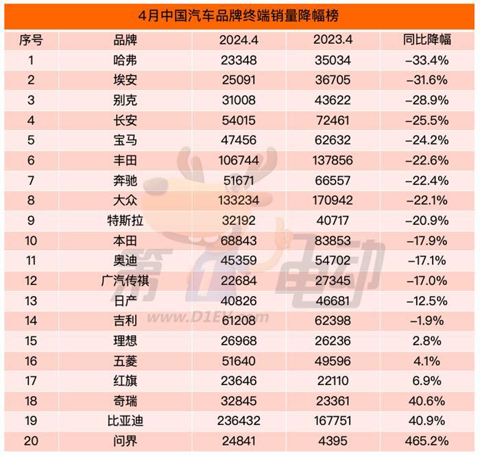 根据4月中国汽车品牌终端销量TOP20降幅榜,哈弗4月终端销量同比大降超33.4%,是降幅最大的品牌,其次是保时捷和埃安,同比均下滑超30%。