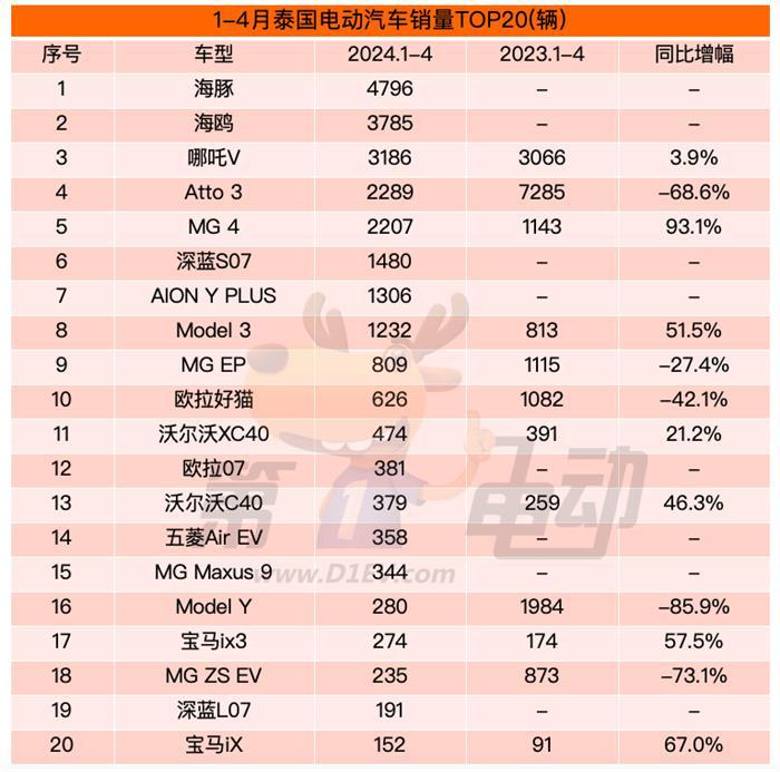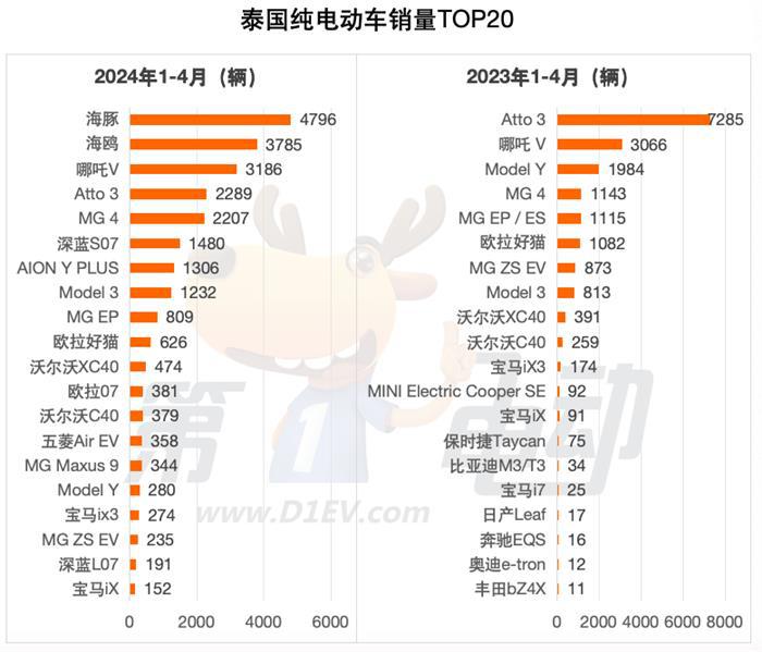 1-4月,泰国汽车市场最受欢迎的三款电动汽车均来自中国,分别是海豚、海鸥和哪吒V,销量均超3000辆。