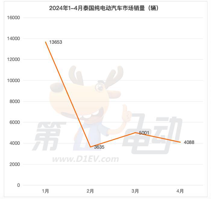根据AUTOLIFETHAILAND数据,2024年4月泰国电动汽车销量4,088辆,环比下降19.9%,占新车总数13.3%。1-4月泰国电动汽车销量26,377辆,与去年同期相比增长41.8%。