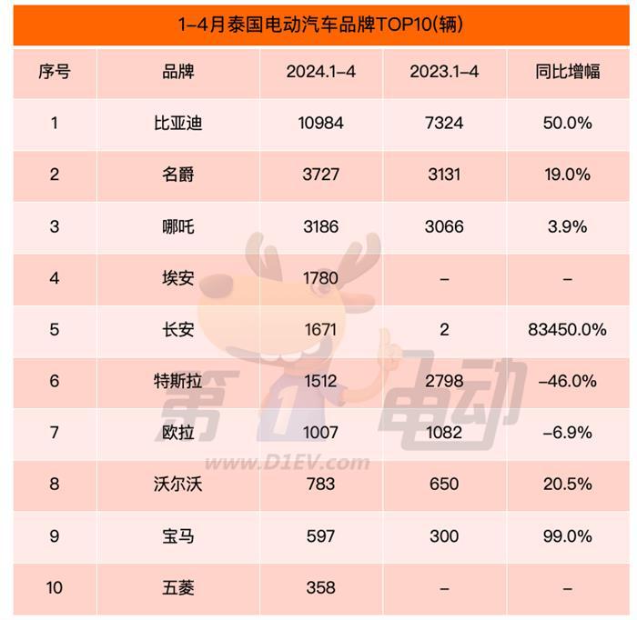 从今年1-4月泰国电动汽车销量来看,中国部分车企已经在泰国取得初步成功。TOP10品牌榜中,除了宝马和特斯拉外,其余8个品牌均来自中国,占比达89%,且埃安和五菱首次进入前十。